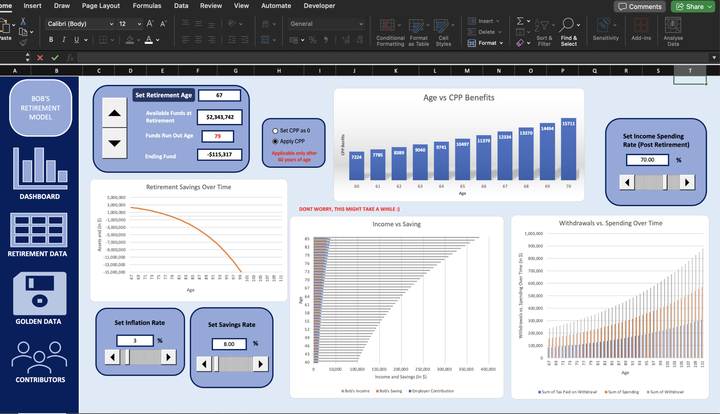 Developed a dynamic Excel dashboard to model personalized retirement planning scenarios. Integrated VBA and Macros to automate calculations and enable interactive features such as drop-down menus, spinners, and live financial projections. Designed for non-technical users to test various retirement ages, savings rates, and investment returns while maintaining a clean interface with hidden calculation sheets.