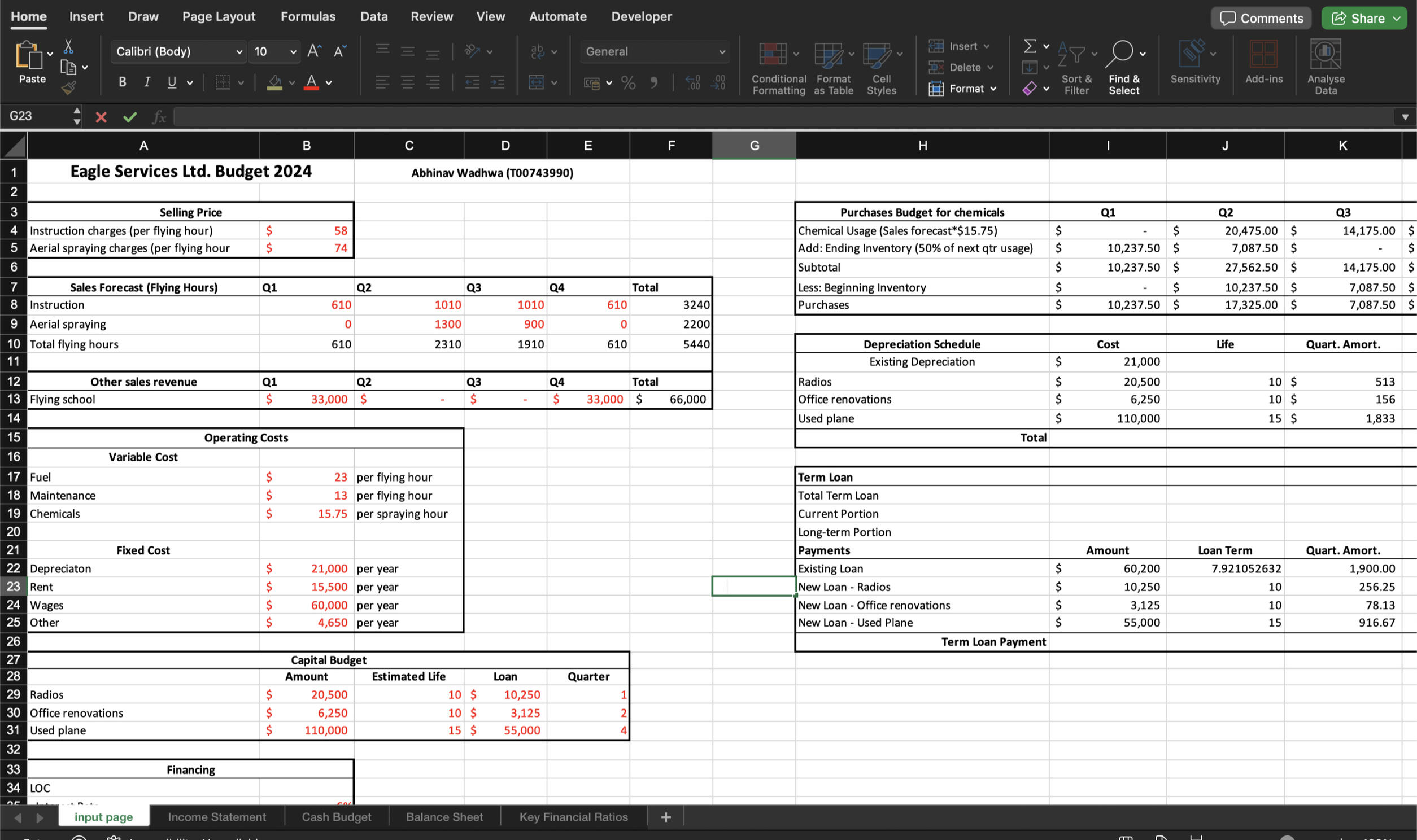 Prepared comprehensive 2024 financial budgets and statements for Eagle Services Ltd., including quarterly forecasts of sales, expenses, cash flows, and ratios. Analyzed major decisions such as the Q4 aircraft purchase, with deliverables covering income statements, cash budgets, balance sheets, and a memorandum rationalizing financial choices.